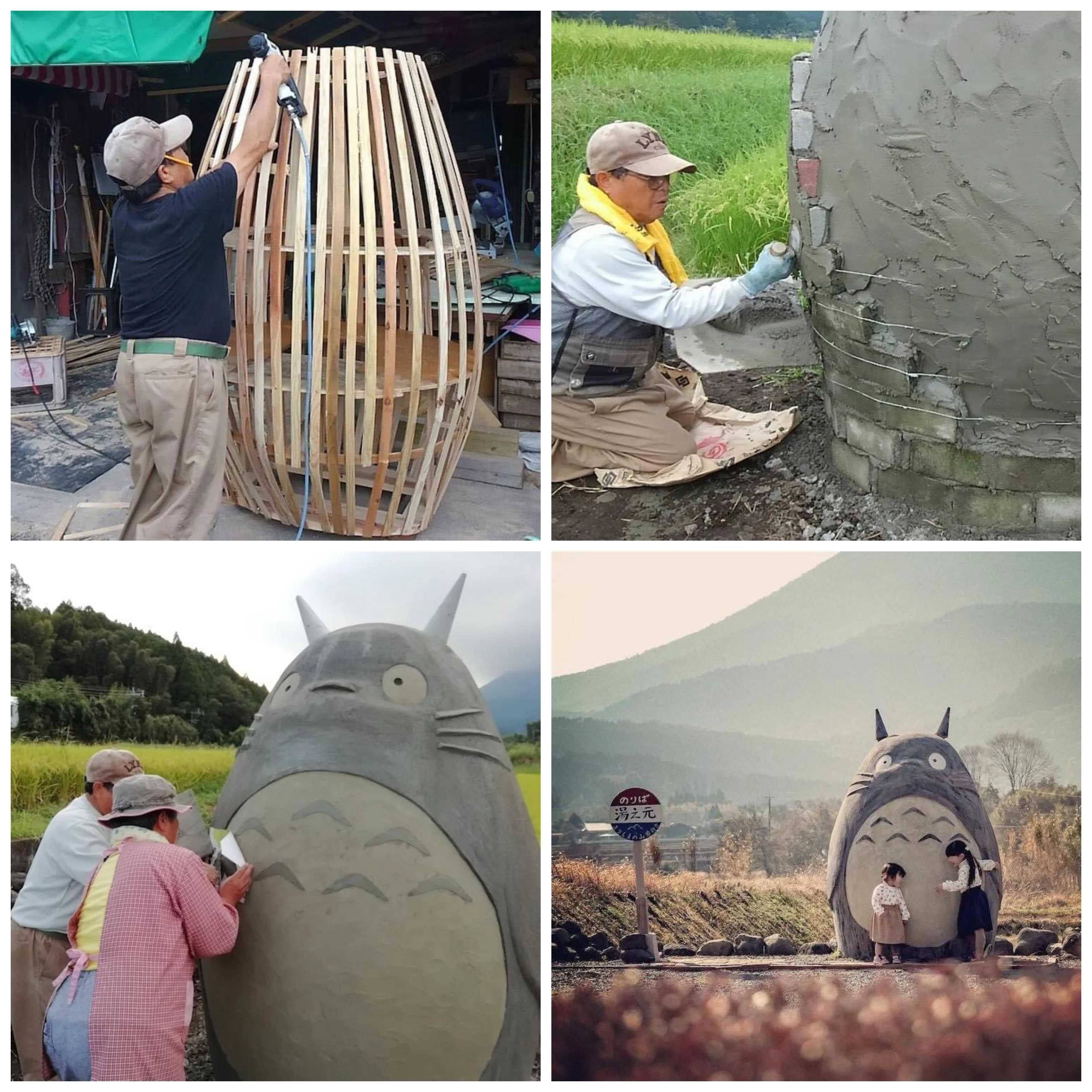 Two Japanese Grandparents Sculpted A Life-Size Totoro and standing next to it in the fields As a result of the statue, which looms over both youngsters and adults alike, not only did the grandkids fall in love with it, but it is also attracting ardent Totoro lovers from all over the world to the small town for this Totoro station.